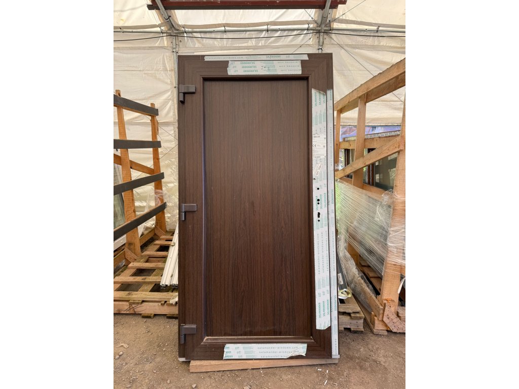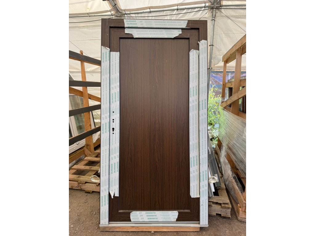 Plastové vchodové dveře profilu Salamander, plné, bez skla. Dveře otevíravé dovnitř.